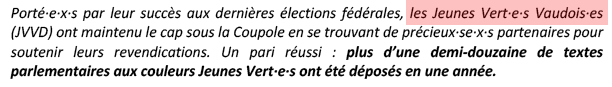 L'exclusion discriminatoire. Pour de mauvaises raisons, de lisibilité, d'économie, d'image de marque, les JVVD sacrifient les x qui se trouvent parmi elleux·xs. Nous leur conseillons, pour être crédible·x·s, de se renommer le plus rapidement possible Jeune·x·s Vert·e·x·s Vaudois·es·xs (12.2020).